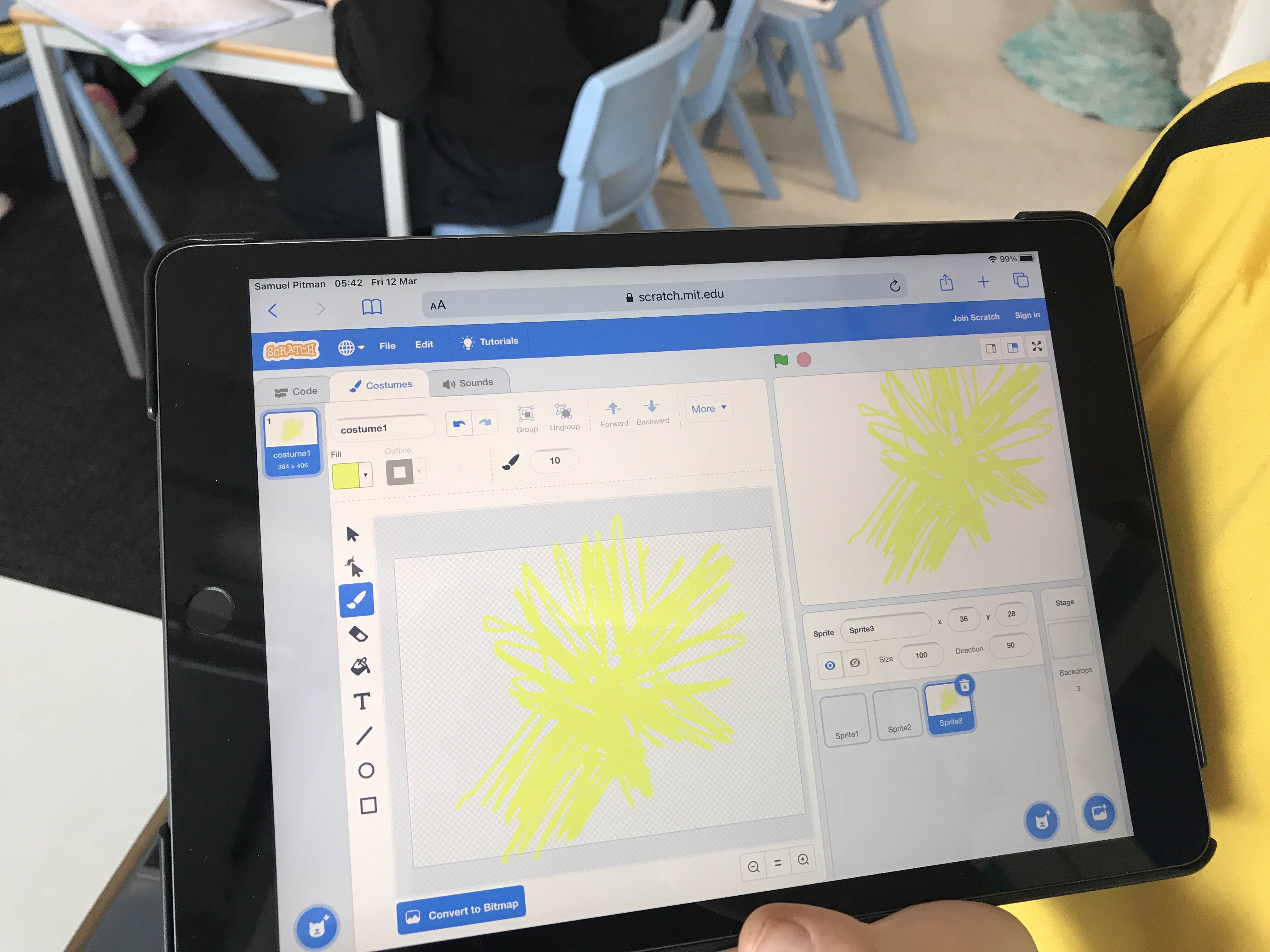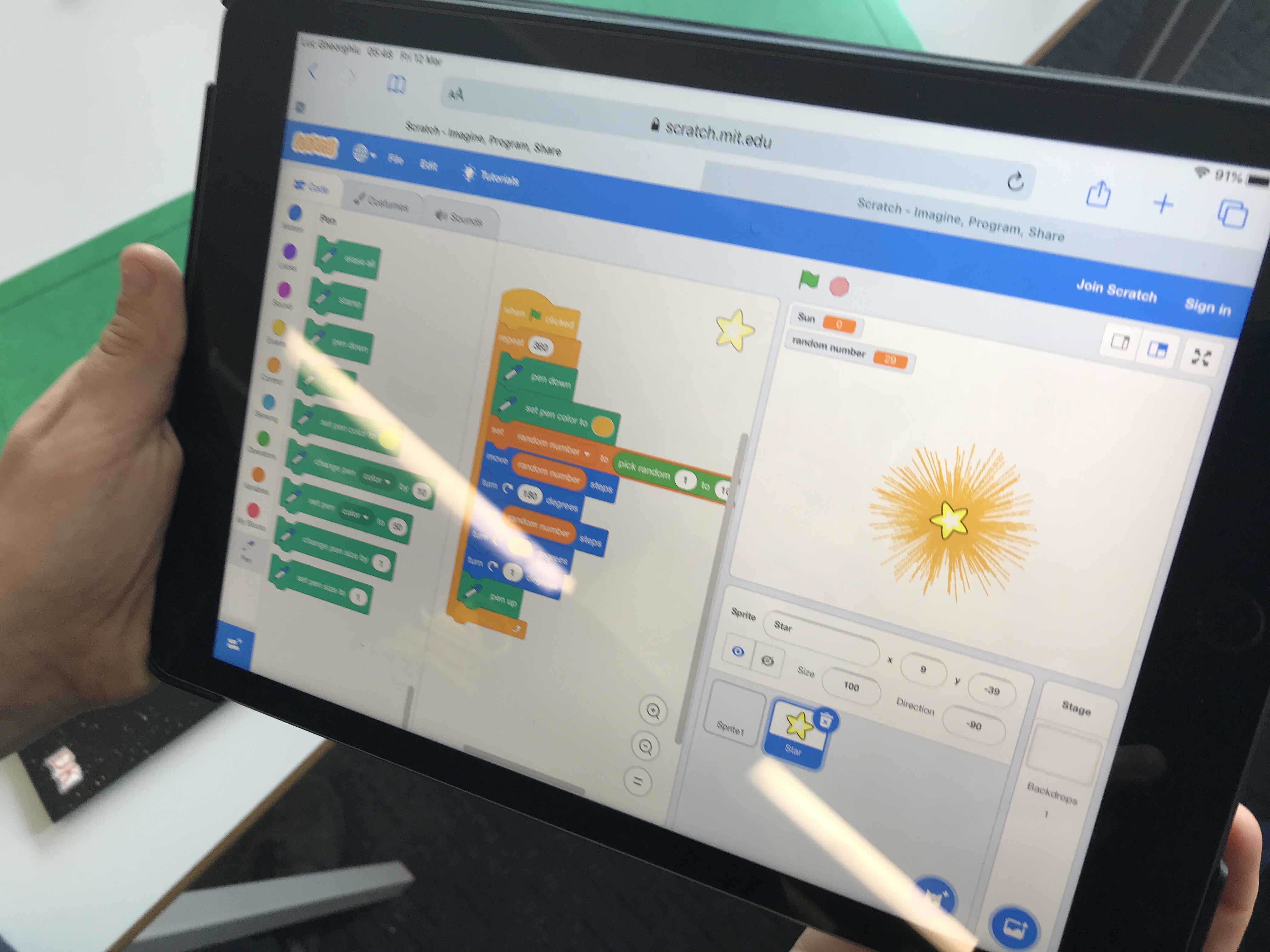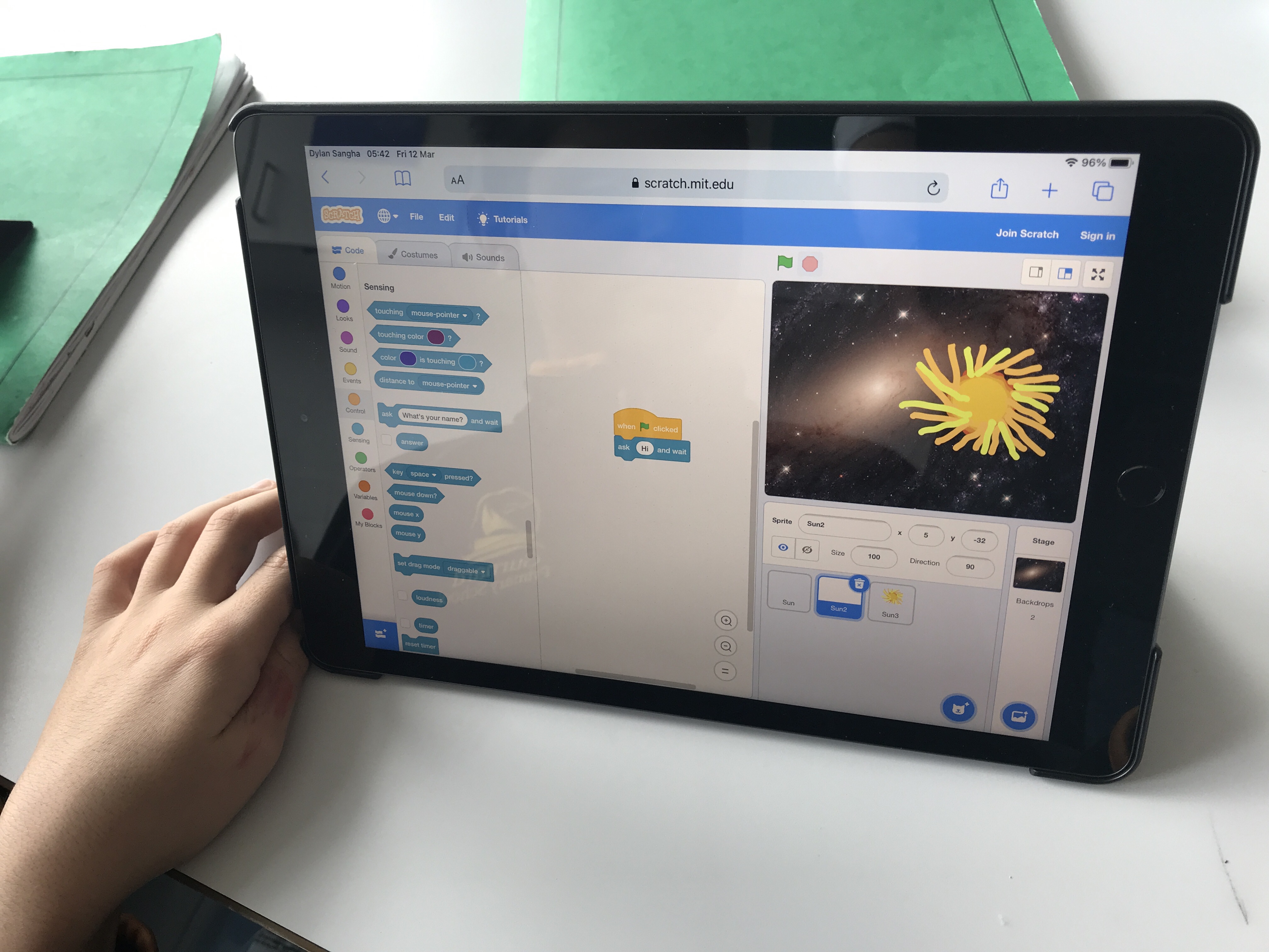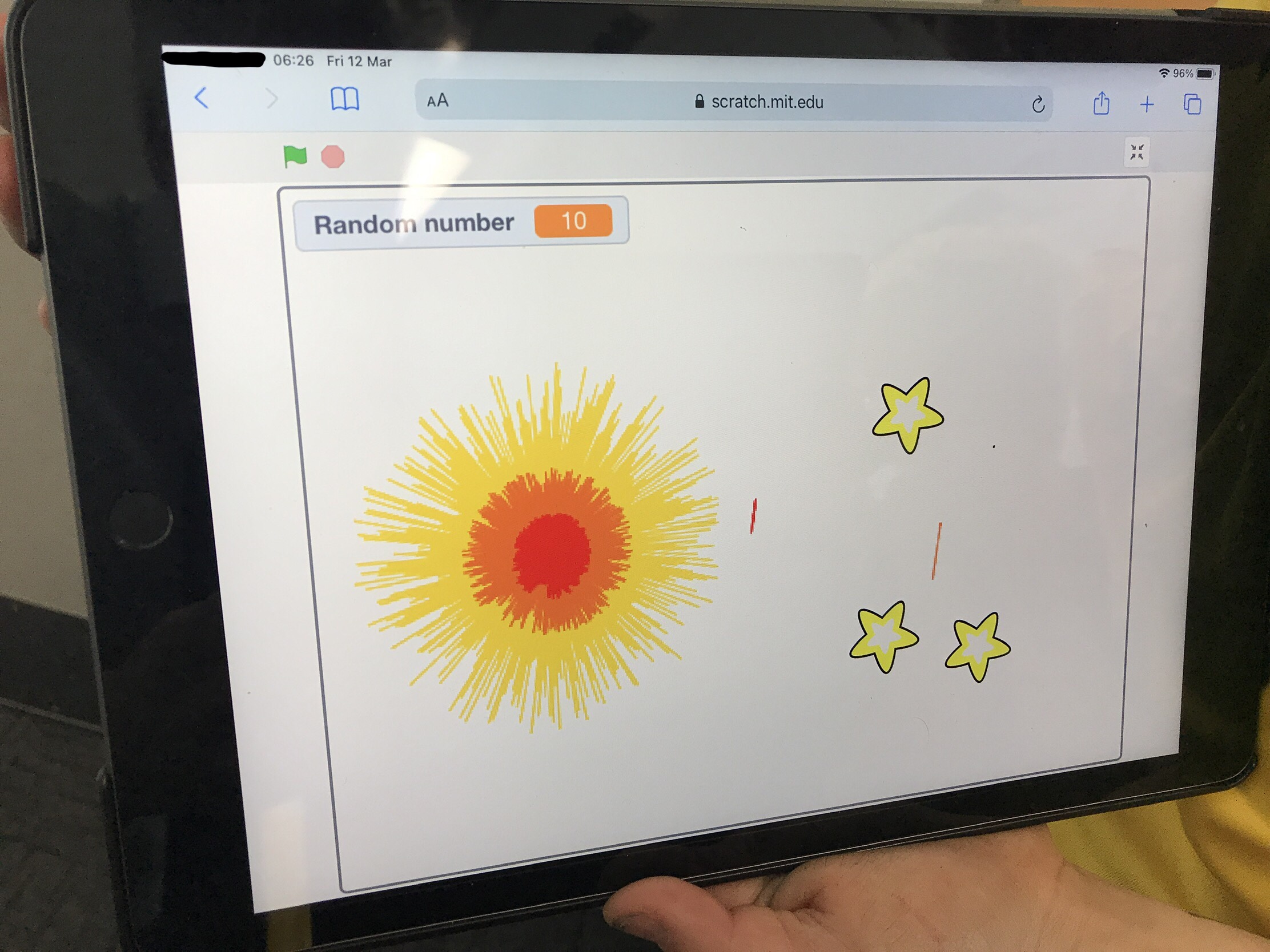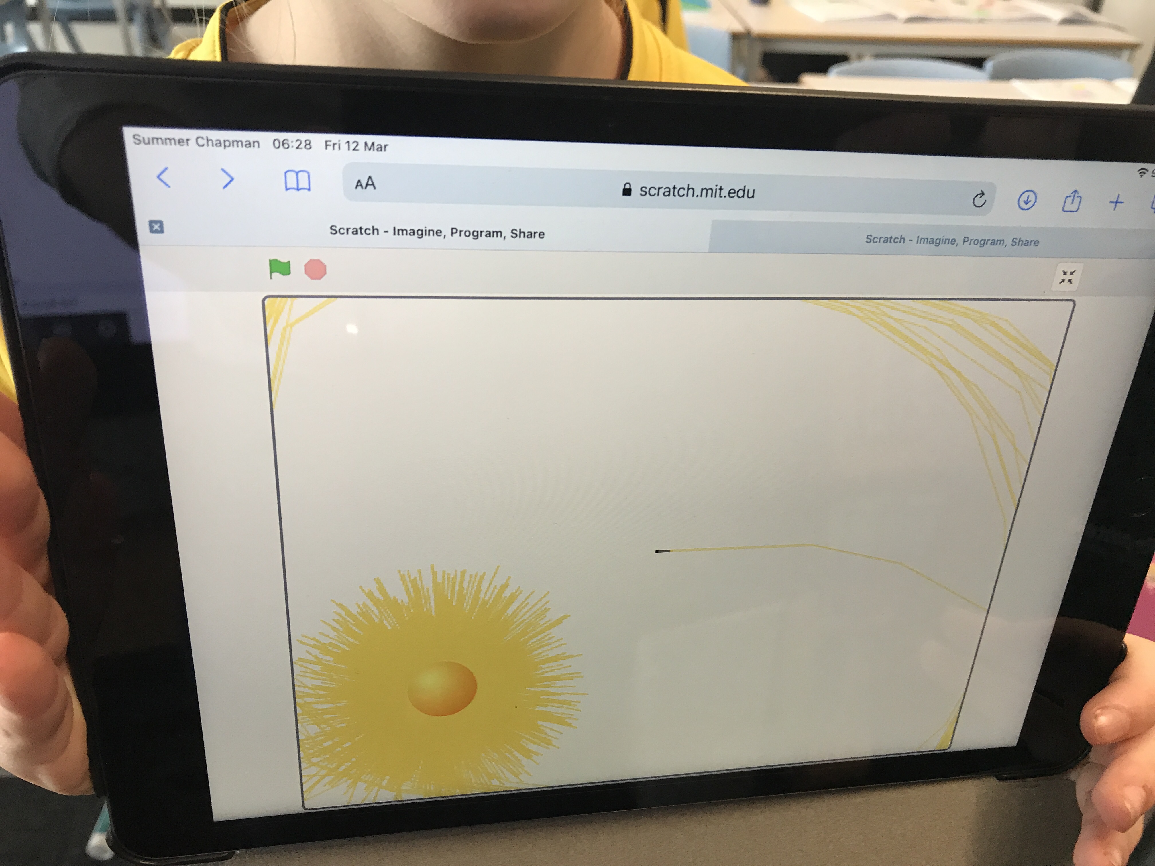 This week we learned how to login to our brand new accounts on the iPads. This was the first lesson where we were able to have an iPad each! Once we had logged in we used Scratch to create some science artwork for science week. We used the pen tool to code an image of the sun! Take a look at our creations below…