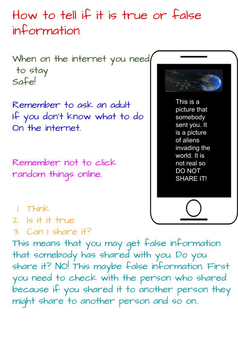 In this lesson we explored how information online can’t always be believed. We talked about how to judge this for ourselves and what to do if we found something that seemed false. We created posters to share this message with children in our school.