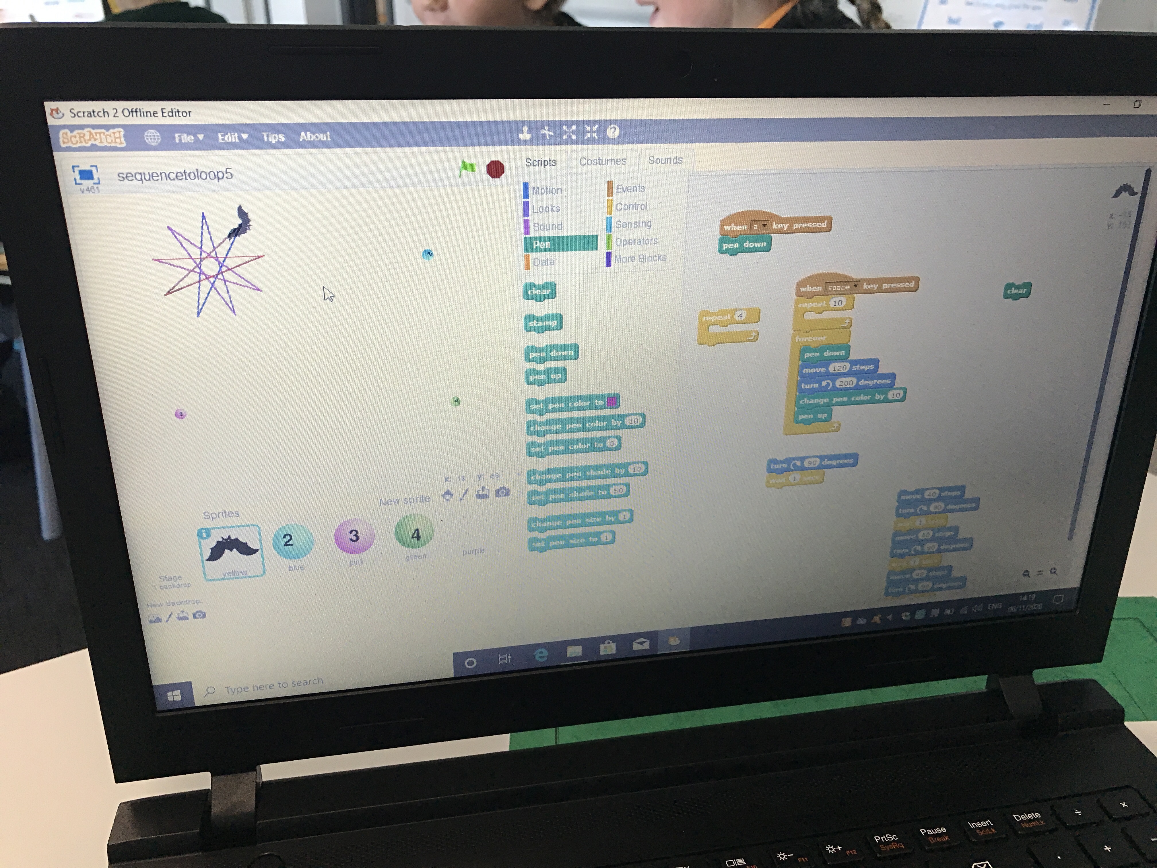 This week we have been exploring how repetition can be used to loop actions in Scratch. We looked at the code first and made predictions about what each would draw before running it and checking if our ideas were correct. ‘Reading’ code is really important as it helps us when we are writing and debugging our own code.